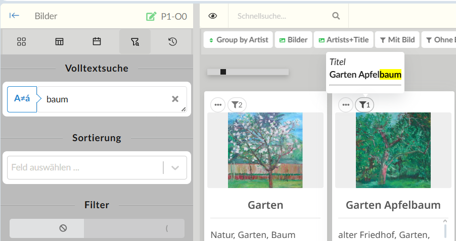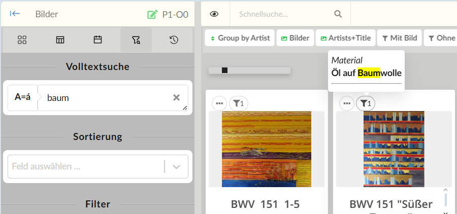 Neben dem Auge-Icon befindet sich ein Eingabefeld für die Schnellsuche. Wird dort etwas eingegeben hat das nur temporär auswirkung auf die Anzeige der Objekte in der Galerie und Tabelarischen ansicht. Es wird nur in den Sichtbaren (also über das Auge ausgewählten) Feldern mit einer Unscharfe-Suche gesucht und die Objekte mit den besten Treffern nach oben sortiert. Die Schnellsuche ist nicht dazu da die Objektauswahl zu ändern, wie es die Sucheinstellungen in der Suchmaske tun, sondern nur um ein Objekt schnell zu finden und aufzurufen. Bei verwendung wird auch die Objektsortierung temporär ignoriert.