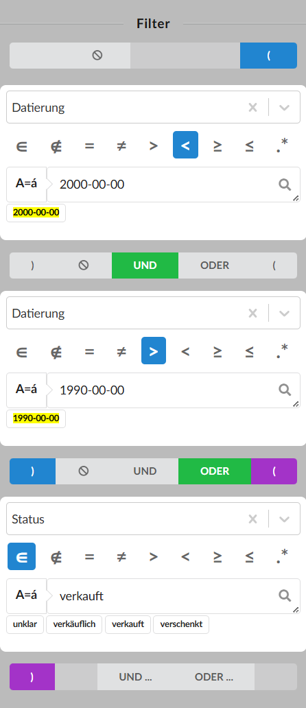 Mit hilfe von Klammern neben den “und” und “oder” Schaltflächen können die Filter gruppiert werden.