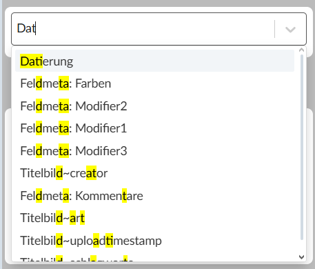 Zunächst muss ein Feld ausgewählt werden, in dem gesucht werden soll. Neben den für dich in dem Projekt verfügbaren Feldern können auch Metadaten wie Farmarkierungen, Quellenangaben oder Kommentare zu den Feldern ausgewählt werden. Es kann auch nach Metadaten von Datei-Feldern gesucht werden, z.B. nach Dateinamen oder Dateityp.