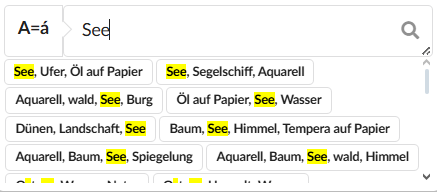 Unter dem Suchbegriff werden Vorschläge passend zur aktuellen Eingabe aus dem Feld angezeigt. Diese können zur Hilfe bei der Eingabe verwendet werden oder durch anklicken direkt übernommen werden.