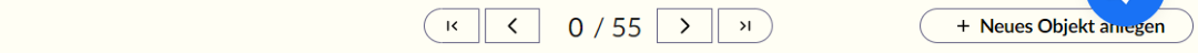 In der Mitte wird das aktuell aktive Objekt angezeigt (z.B. “0” oder die Anzahl der angezeigten Objekte). Rechts und links davon findest du Navigationstasten, mit denen du zwischen den Objekten der aktuellen Auswahl wechseln kannst. Außerdem gibt es eine Schaltfläche zum Anlegen eines neuen Objekts sowie eine blaue Chat-Schaltfläche für den Support, sofern dieser aktiv ist.